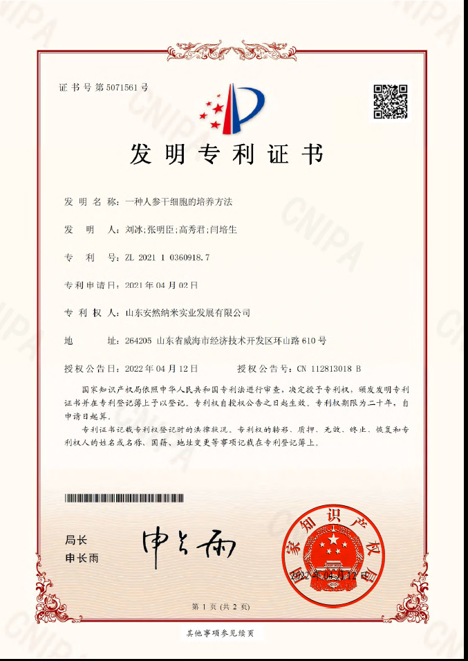 中国发明专利,专利号:ZL 2021 1 0360918.7 发明名称:一种人参干细胞的培养方法
